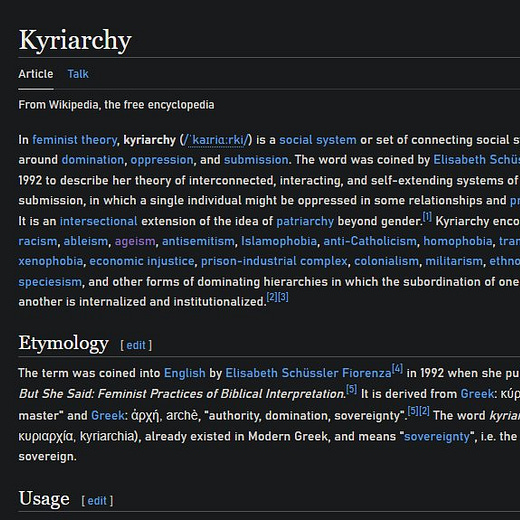 a neologism…derived from the Greek words for “lord” or “master” (kyrios) and “to rule or dominate” (archein) which seeks to redefine the analytic category of patriarchy in terms of multiplicative intersecting structures of domination… Kyriarchy is best theorized as a complex pyramidal system of intersecting multiplicative social structures of superordination and subordination, of ruling and oppression.